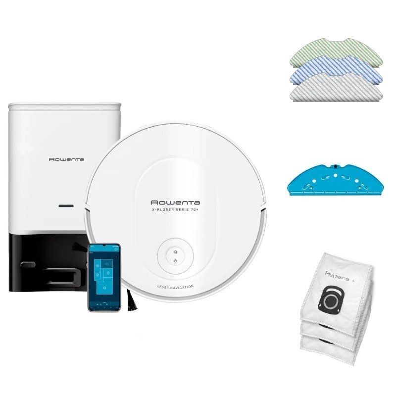 - ¿QUÉ HAY EN LA CAJA?: Robot aspirador con mopa X-PLORER Serie 70+, mopa estándar blanca y gris para todos los suelos, mopa blanca y azul para manchas difíciles, mopa electrostática blanca y verde para usar sin agua, estación de vaciado automático del depósito de suciedad, mopa, 3 bolsas Hygiene+